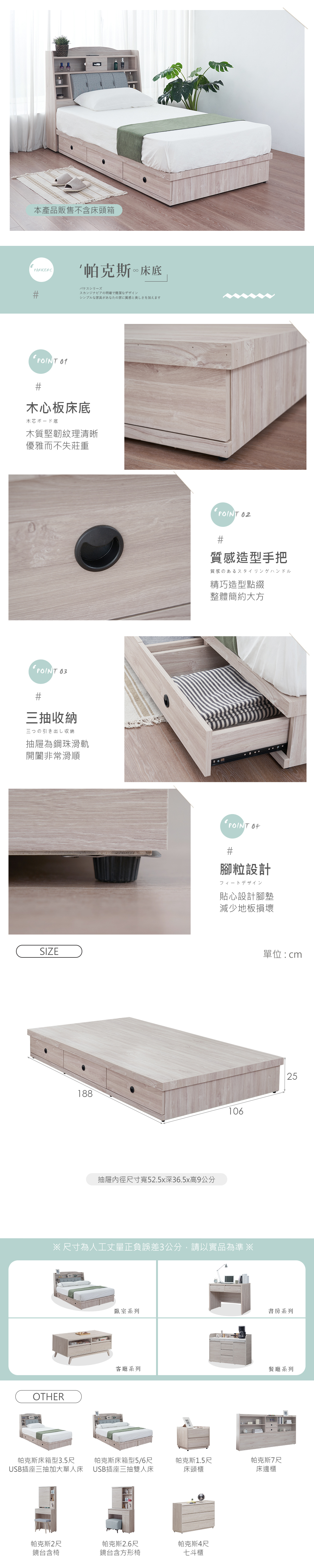 【時尚屋】[5V24]帕克斯3.5尺三抽加大單人床底,色系橡木色為主,點綴臥室視覺空間美感,材質上採用木心板、鋼珠滑軌等,均高於市場之產品規格,品質絕對有保證!此單人床底舒適程度絕對可滿足您的需求!設計質感及耐用性絕對是首選。有了他絕對可以讓您煥然一新!時尚屋帶給您對家具時尚新品味。