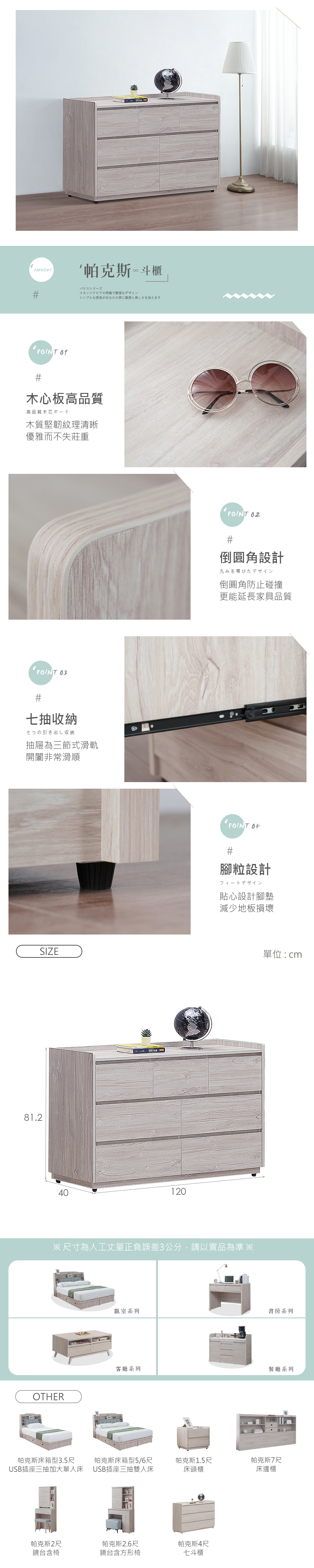 【時尚屋】[5V24]帕克斯4尺七斗櫃,色系橡木色為主,點綴臥室視覺空間美感,材質上採用木心板、三節式滑軌等,均高於市場之產品規格,品質絕對有保證!此斗櫃在收納空間上採七抽,絕對可滿足您對收納的需求,相當於收納櫃之功能!有了他絕對可以讓您煥然一新!時尚屋帶給您對家具時尚新品味。