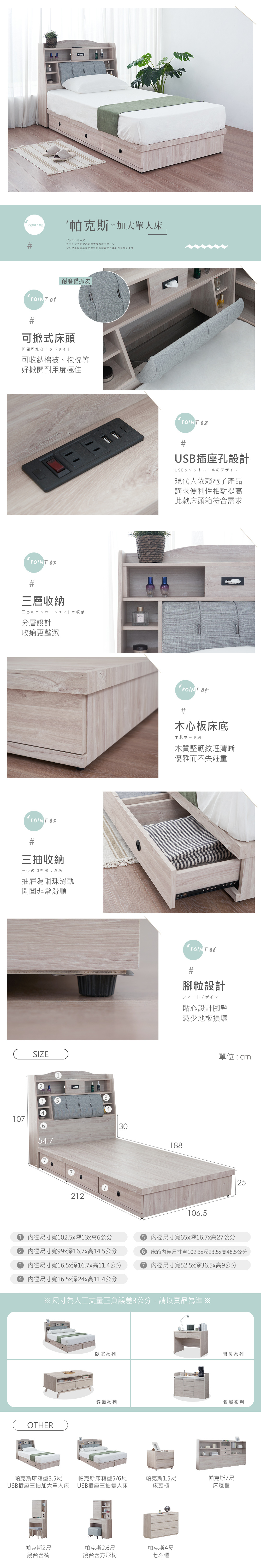 帕克斯床箱型3.5尺USB插座三抽加大單人床