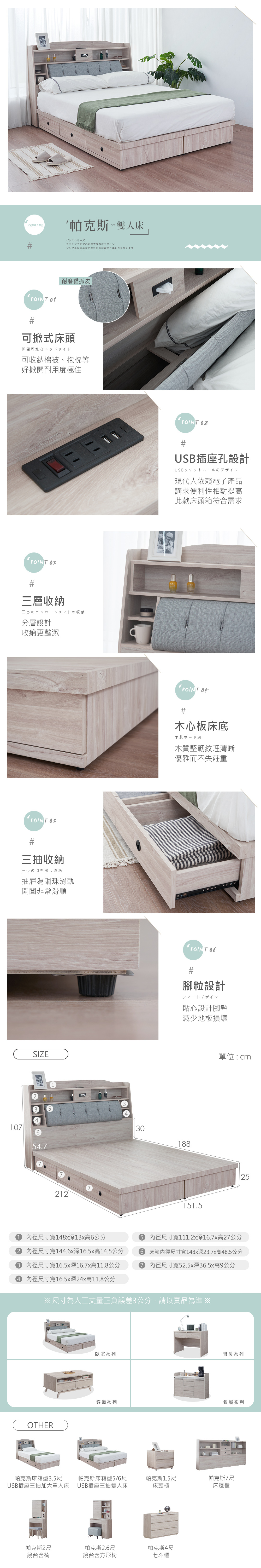 名稱:帕克斯床箱型5尺USB插座三抽雙人床