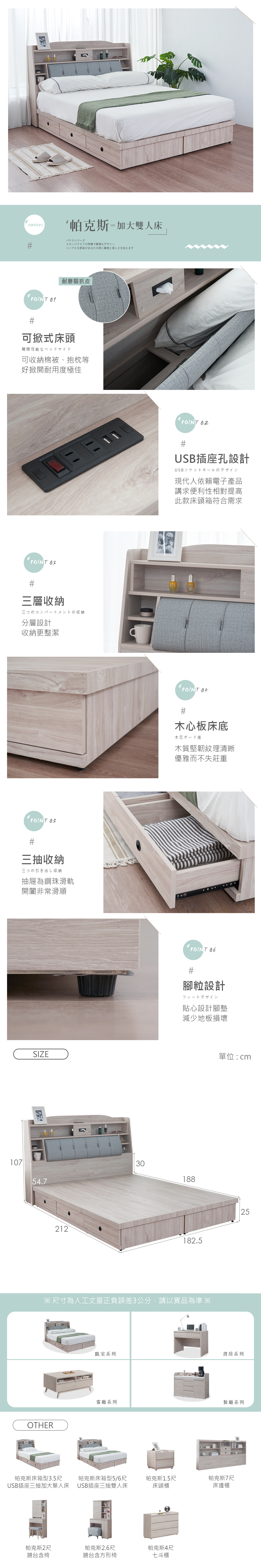 帕克斯床箱型6尺USB插座三抽加大雙人床
