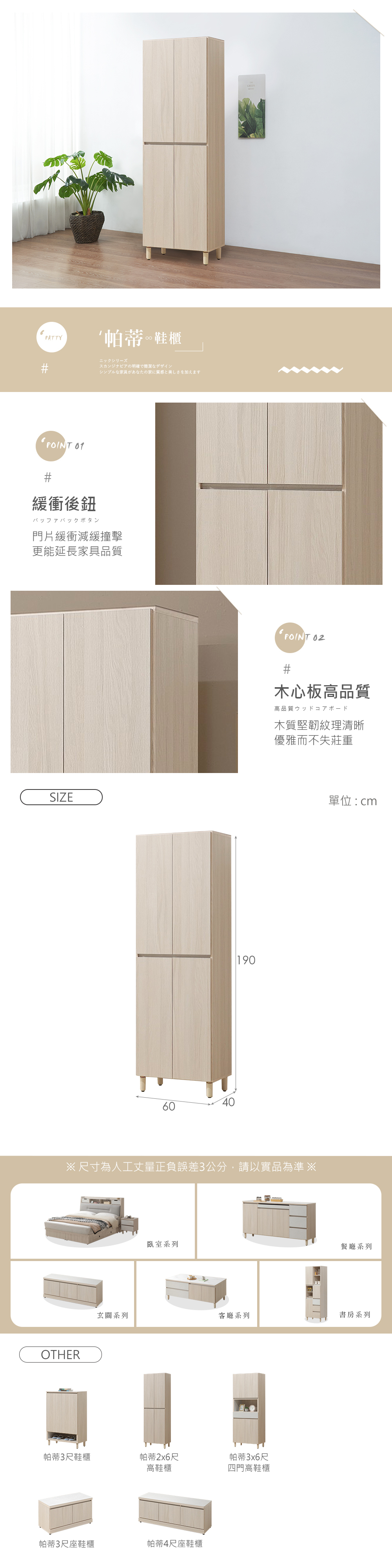 【時尚屋】[CW23]帕蒂2x6尺高鞋櫃,色系白榆木色為主,點綴玄關視覺空間美感,材質上採用木心板、緩衝後鈕等,均高於市場之產品規格,品質絕對有保證!此鞋櫃在收納空間上採雙開門,絕對可滿足您對收納的需求,相當於收納櫃之功能!有了他絕對可以讓您煥然一新!時尚屋帶給您對家具時尚新品味。