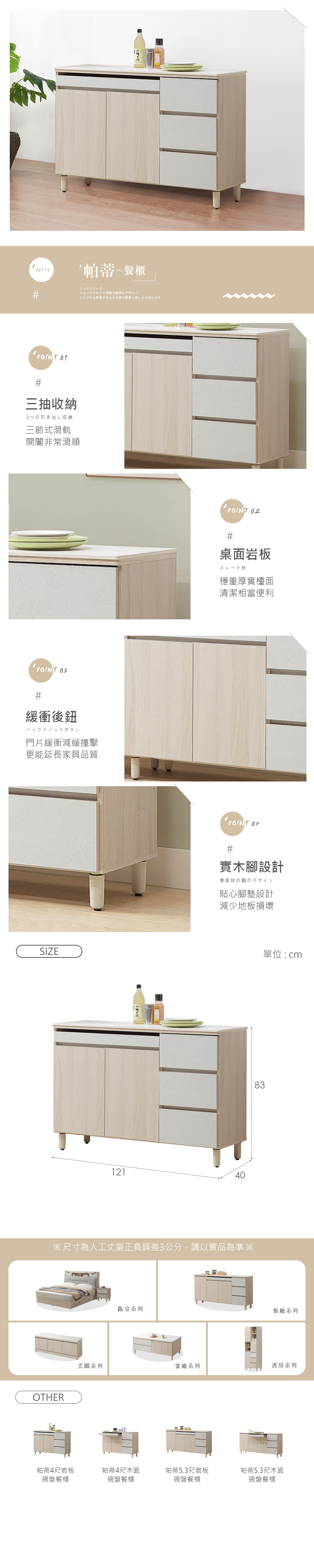 【時尚屋】[CW23]帕蒂4尺岩板碗盤餐櫃,色系白榆木色為主,點綴廚房視覺空間美感,材質上採用木心板、緩衝後鈕、三節式滑軌、岩板等,均高於市場之產品規格,品質絕對有保證!此餐櫃在收納空間上採三抽+雙開門,絕對可滿足您對收納的需求,相當於收納櫃之功能!有了他絕對可以讓您煥然一新!時尚屋帶給您對家具時尚新品味。
