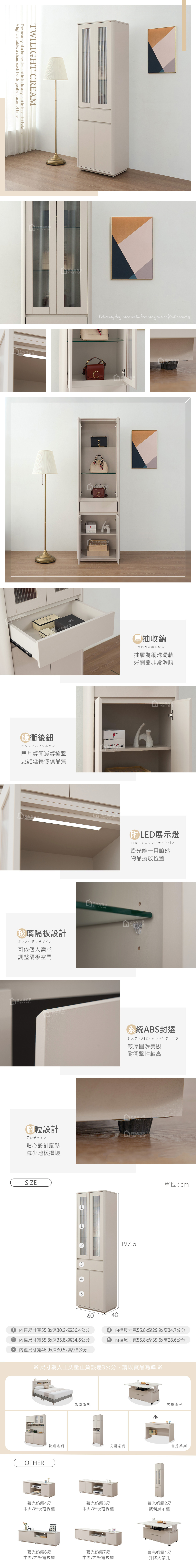 【時尚屋】[MX23]暮光奶霜2尺LED燈展示櫃,色系奶茶色為主,點綴客廳視覺空間美感,材質上採用木心板、緩衝後鈕、鋼珠滑軌等,均高於市場之產品規格,品質絕對有保證!此展示櫃在收納空間上採單抽,絕對可滿足您對收納的需求,相當於收納櫃之功能!有了他絕對可以讓您煥然一新!時尚屋帶給您對家具時尚新品味。