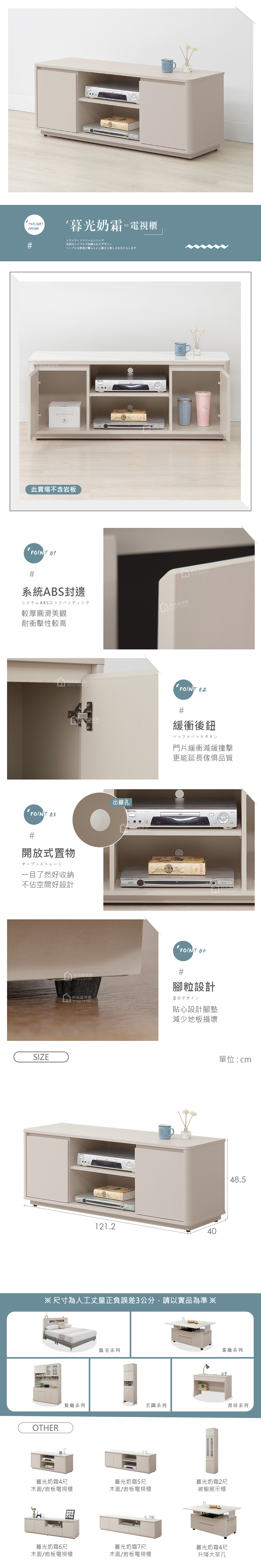 【時尚屋】[MX23]暮光奶霜4尺電視櫃,色系奶茶色為主,點綴客廳視覺空間美感,材質上採用木心板、緩衝後鈕等,均高於市場之產品規格,品質絕對有保證!此電視櫃在收納空間上採單開門,絕對可滿足您對收納的需求,相當於收納櫃之功能!有了他絕對可以讓您煥然一新!時尚屋帶給您對家具時尚新品味。