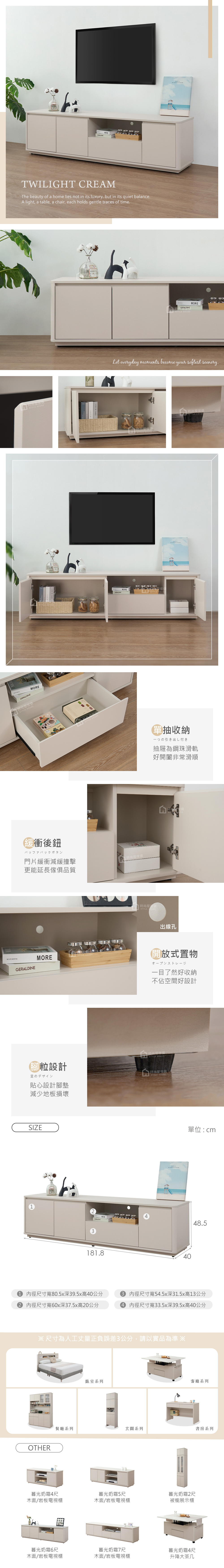【時尚屋】[MX23]暮光奶霜6尺電視櫃,色系奶茶色為主,點綴客廳視覺空間美感,材質上採用木心板、緩衝後鈕、鋼珠滑軌等,均高於市場之產品規格,品質絕對有保證!此電視櫃在收納空間上採單抽,絕對可滿足您對收納的需求,相當於收納櫃之功能!有了他絕對可以讓您煥然一新!時尚屋帶給您對家具時尚新品味。