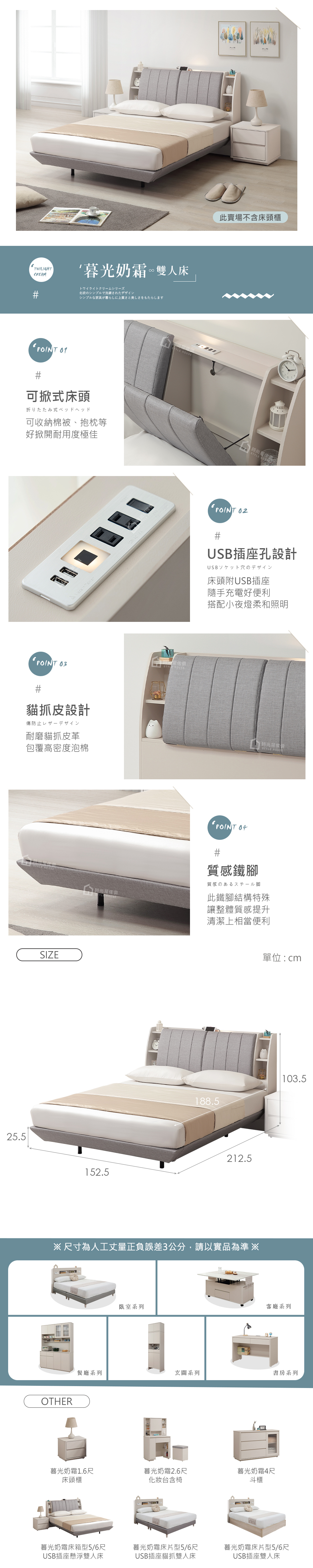 名稱:暮光奶霜床箱型5尺USB插座懸浮雙人床