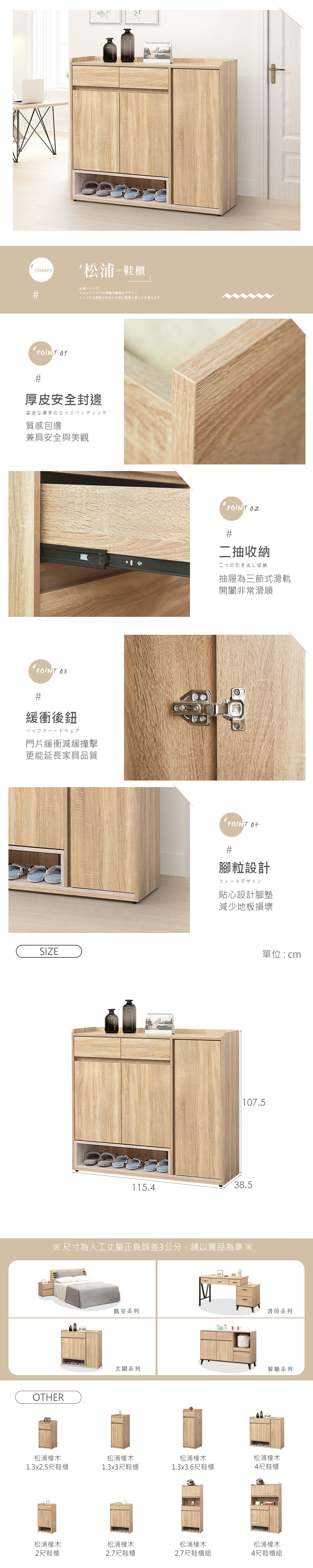 【時尚屋】[XV11]松浦橡木4尺鞋櫃,色系橡木色為主,點綴玄關視覺空間美感,材質上採用木心板、三節式滑軌、緩衝後鈕等,均高於市場之產品規格,品質絕對有保證!此鞋櫃在收納空間上採二抽+單雙開門,絕對可滿足您對收納的需求,相當於收納櫃之功能!有了他絕對可以讓您煥然一新!時尚屋帶給您對家具時尚新品味。