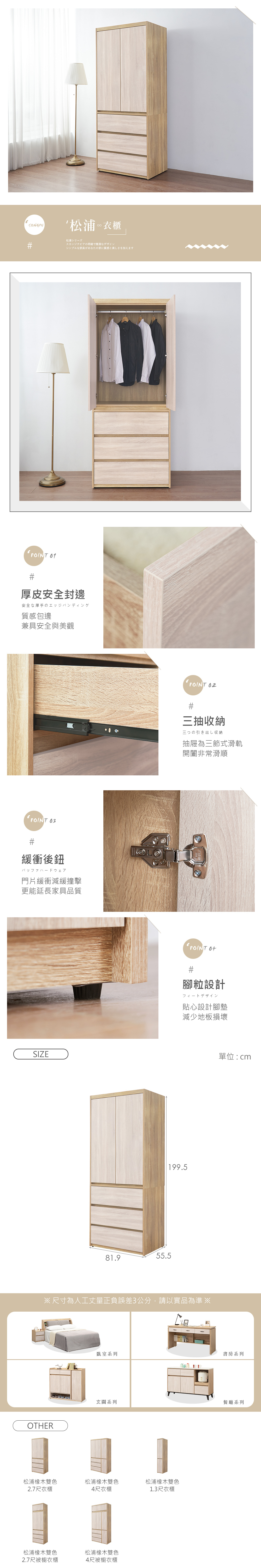 【時尚屋】[XV11]松浦橡木雙色2.7尺衣櫃,色系橡木雙色為主,點綴臥室視覺空間美感,材質上採用木心板、緩衝後鈕、三節式滑軌等,均高於市場之產品規格,品質絕對有保證!此衣櫃在收納空間上採三抽+雙開門,絕對可滿足您對收納的需求,相當於收納櫃之功能!有了他絕對可以讓您煥然一新!時尚屋帶給您對家具時尚新品味。