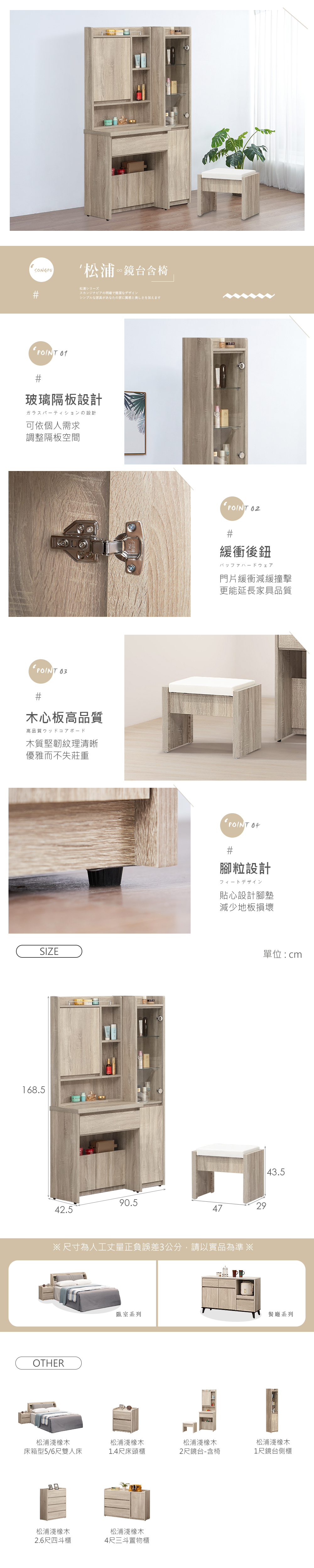 名稱:松浦淺橡木3尺鏡台側櫃組含椅