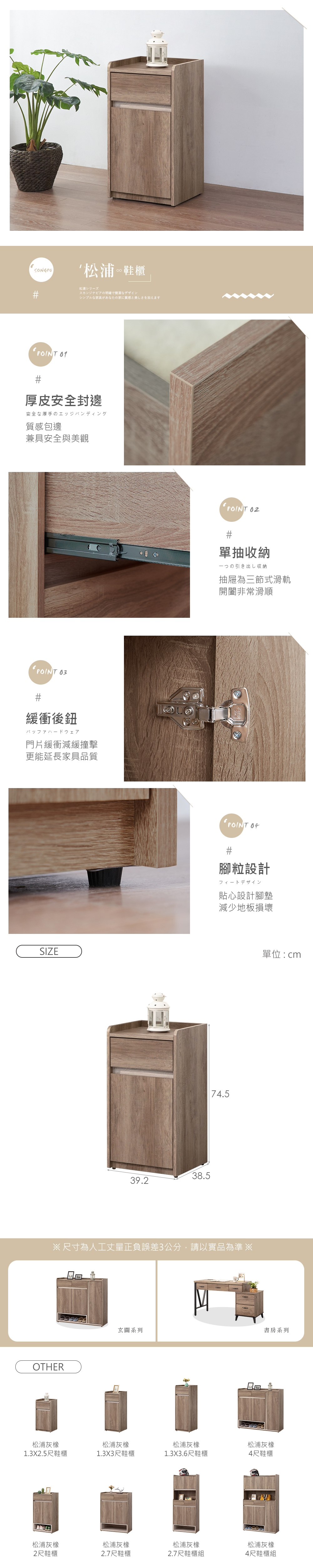 【時尚屋】[XV11]松浦灰橡1.3x2.5尺鞋櫃,色系灰橡色為主,點綴玄關視覺空間美感,材質上採用木心板、三節式滑軌、緩衝後鈕等,均高於市場之產品規格,品質絕對有保證!此鞋櫃在收納空間上採單抽+單開門,絕對可滿足您對收納的需求,相當於收納櫃之功能!有了他絕對可以讓您煥然一新!時尚屋帶給您對家具時尚新品味。
