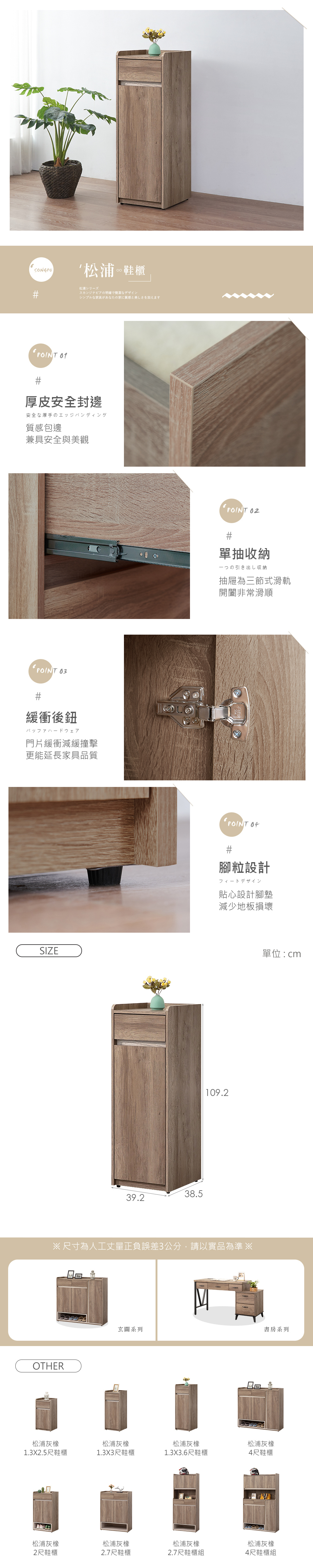 【時尚屋】[XV11]松浦灰橡1.3x3.6尺鞋櫃,色系灰橡色為主,點綴玄關視覺空間美感,材質上採用木心板、三節式滑軌、緩衝後鈕等,均高於市場之產品規格,品質絕對有保證!此鞋櫃在收納空間上採單抽+單開門,絕對可滿足您對收納的需求,相當於收納櫃之功能!有了他絕對可以讓您煥然一新!時尚屋帶給您對家具時尚新品味。