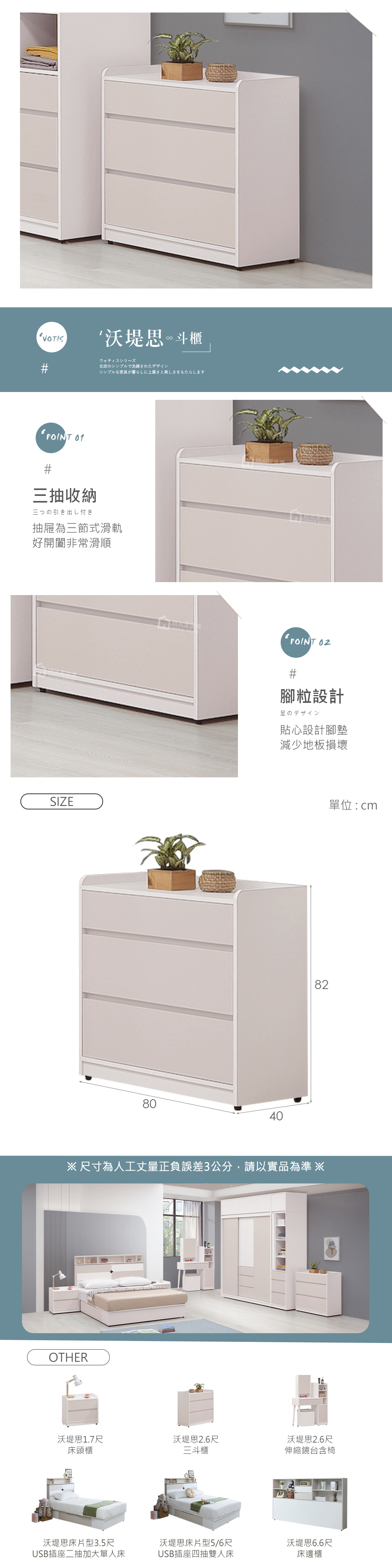 【時尚屋】[GZ14]沃堤思2.6尺三斗櫃,色系馥列白奶茶色為主,點綴臥室視覺空間美感,材質上採用木心板、三節式滑軌等,均高於市場之產品規格,品質絕對有保證!此斗櫃在收納空間上採三抽,絕對可滿足您對收納的需求,相當於收納櫃之功能!有了他絕對可以讓您煥然一新!時尚屋帶給您對家具時尚新品味。