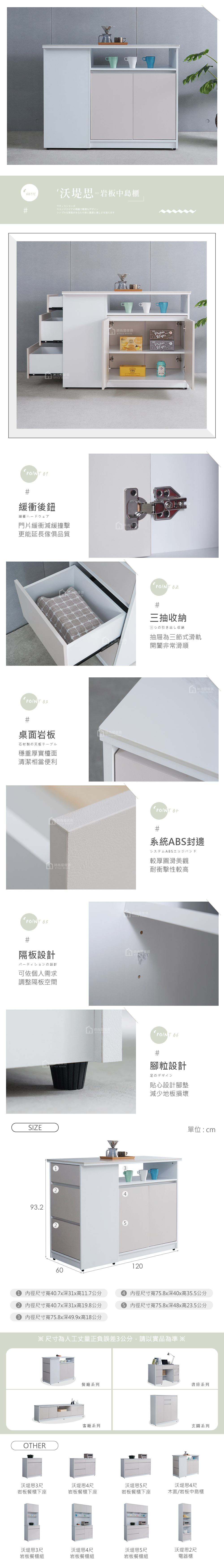 【時尚屋】[GZ13]沃堤思4尺岩板中島櫃,色系馥列白奶茶色為主,點綴廚房視覺空間美感,材質上採用木心板、三節式滑軌、緩衝後鈕、ABS封邊、桌面岩板等,均高於市場之產品規格,品質絕對有保證!此中島櫃在收納空間上採三抽+雙開門,絕對可滿足您對收納的需求,相當於收納櫃之功能!有了他絕對可以讓您煥然一新!時尚屋帶給您對家具時尚新品味。