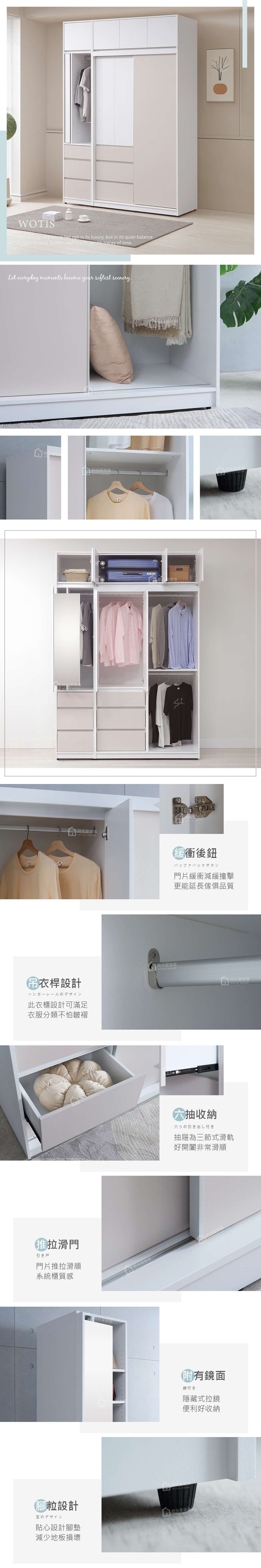 【時尚屋】[GZ14]沃堤思5.5尺被櫥衣櫃,色系馥列白奶茶色為主,點綴臥室視覺空間美感,材質上採用木心板、三節式滑軌、緩衝後鈕等,均高於市場之產品規格,品質絕對有保證!此衣櫃在收納空間上採六抽,絕對可滿足您對收納的需求,相當於收納櫃之功能!有了他絕對可以讓您煥然一新!時尚屋帶給您對家具時尚新品味。