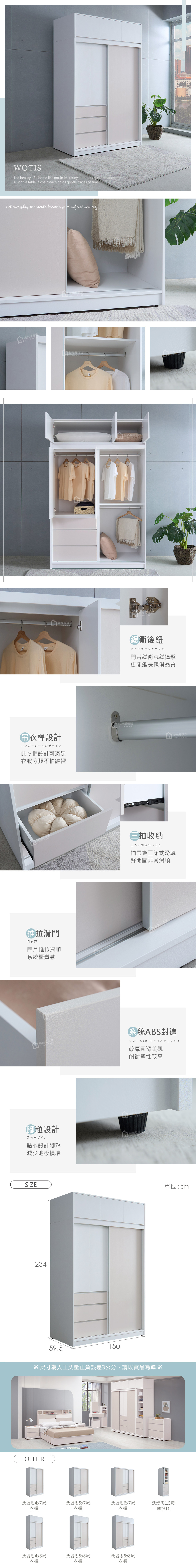 【時尚屋】[GZ14]沃堤思5x8尺衣櫃,色系馥列白奶茶色為主,點綴臥室視覺空間美感,材質上採用木心板、三節式滑軌、緩衝後鈕等,均高於市場之產品規格,品質絕對有保證!此衣櫃在收納空間上採三抽,絕對可滿足您對收納的需求,相當於收納櫃之功能!有了他絕對可以讓您煥然一新!時尚屋帶給您對家具時尚新品味。