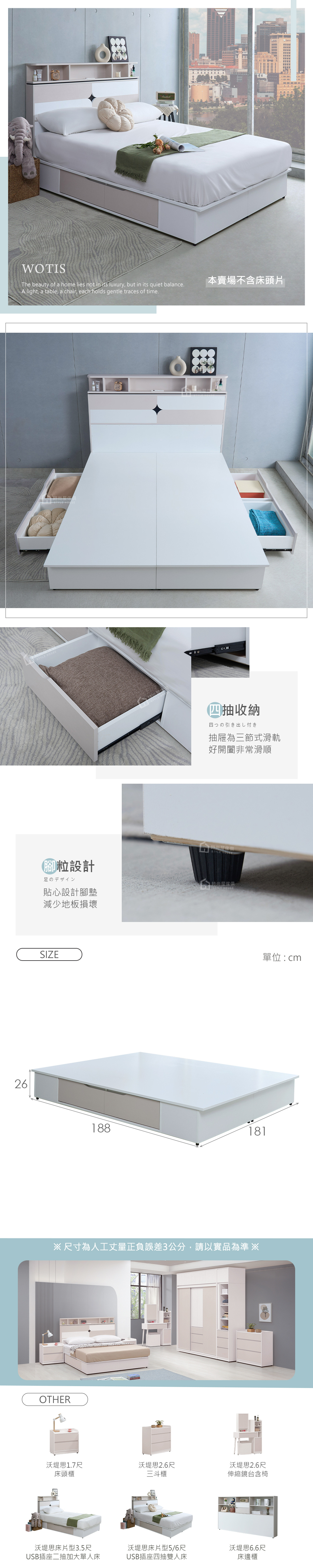 【時尚屋】[GZ14]沃堤思6尺四抽加大雙人床底,色系馥列白奶茶色為主,點綴臥室視覺空間美感,材質上採用木心板、三節式滑軌等,均高於市場之產品規格,品質絕對有保證!此床組舒適程度絕對可滿足您的需求!設計質感及耐用性絕對是首選。有了他絕對可以讓您煥然一新!時尚屋帶給您對家具時尚新品味。