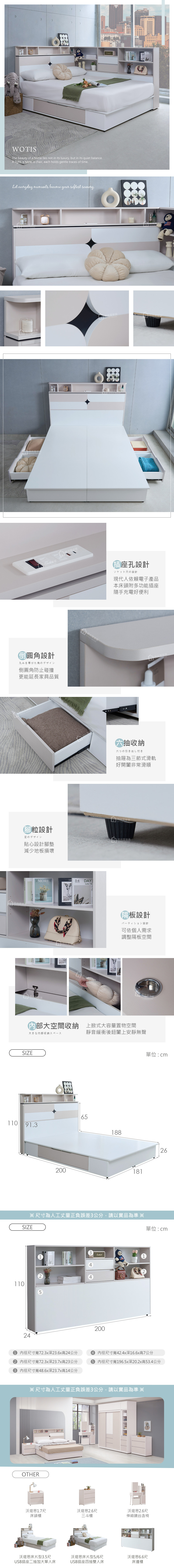 尺寸:床組-寬181x深200x高110公分、床邊櫃-寬200x深24x高110公分