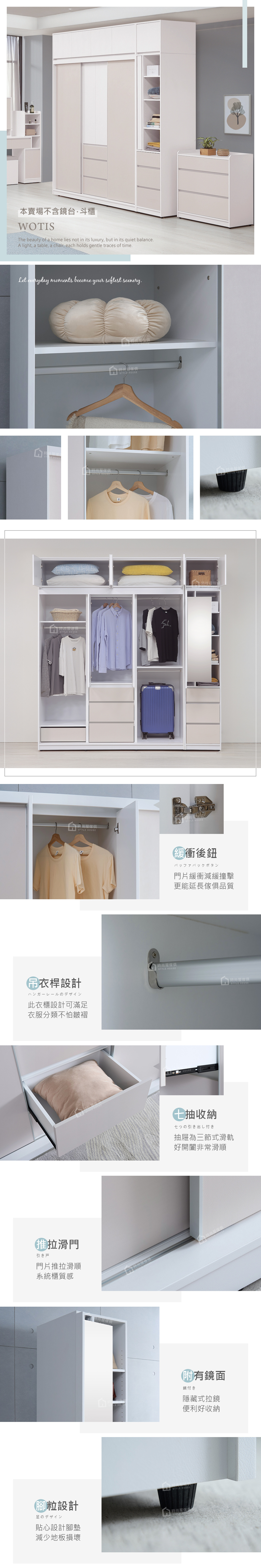 【時尚屋】[GZ14]沃堤思7.5尺被櫥衣櫃,色系馥列白奶茶色為主,點綴臥室視覺空間美感,材質上採用木心板、三節式滑軌、緩衝後鈕等,均高於市場之產品規格,品質絕對有保證!此衣櫃在收納空間上採七抽,絕對可滿足您對收納的需求,相當於收納櫃之功能!有了他絕對可以讓您煥然一新!時尚屋帶給您對家具時尚新品味。