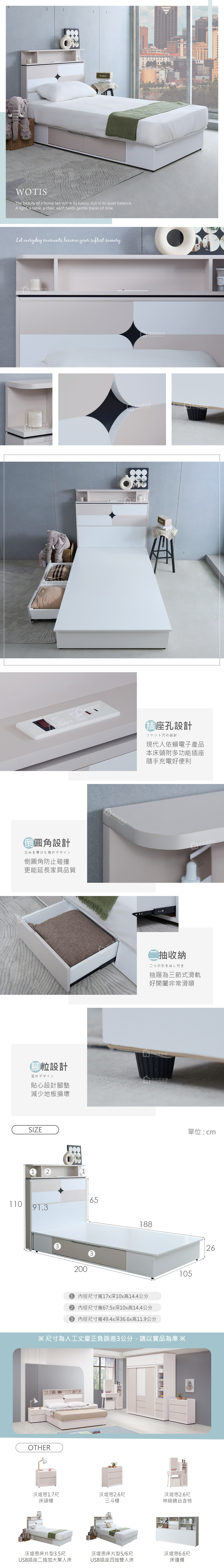 名稱:沃堤思床片型3.5尺USB插座二抽加大單人床
