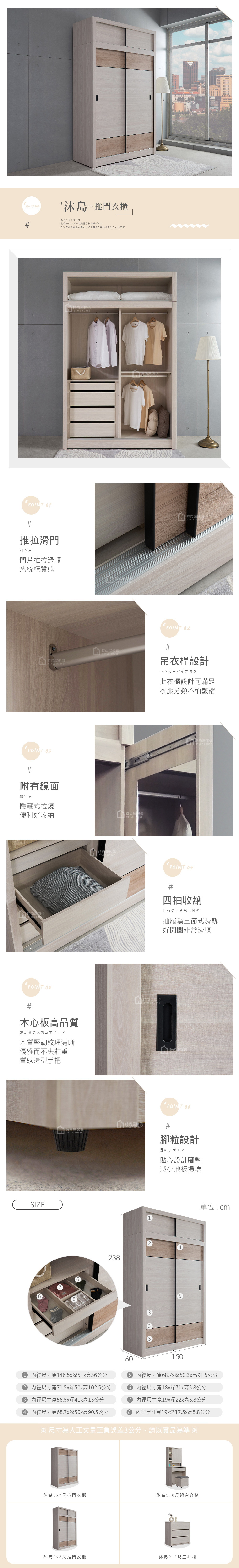 【時尚屋】[FR14]沐島5x8尺推門衣櫃,色系白櫸木色為主,點綴臥室視覺空間美感,材質上採用木心板、三節式滑軌等,均高於市場之產品規格,品質絕對有保證!此衣櫃在收納空間上採推門+四抽,絕對可滿足您對收納的需求,相當於收納櫃之功能!有了他絕對可以讓您煥然一新!時尚屋帶給您對家具時尚新品味。