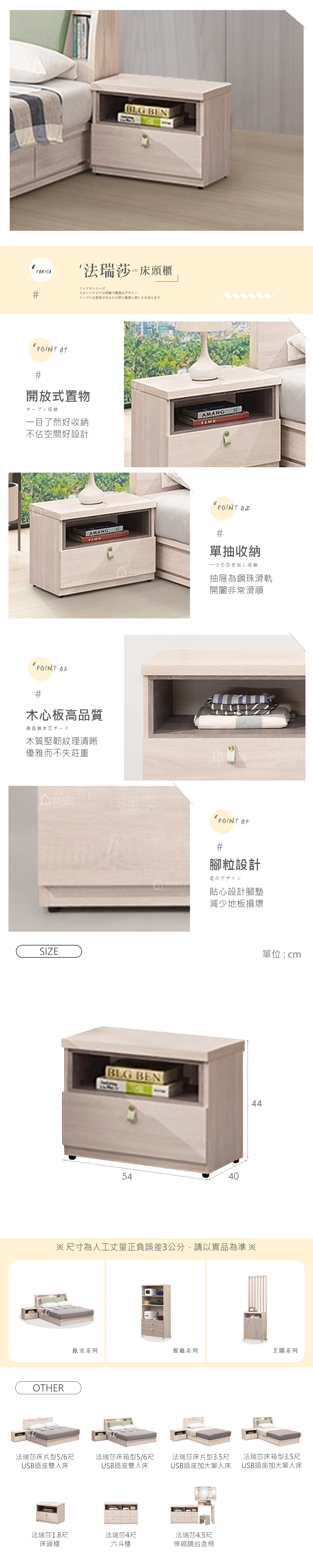 【時尚屋】[MZ23]法瑞莎1.8尺床頭櫃,色系白橡色為主,點綴臥室視覺空間美感,材質上採用木心板、鋼珠滑軌等,均高於市場之產品規格,品質絕對有保證!此床頭櫃在收納空間上採單抽,絕對可滿足您對收納的需求,相當於收納櫃之功能!有了他絕對可以讓您煥然一新!時尚屋帶給您對家具時尚新品味。