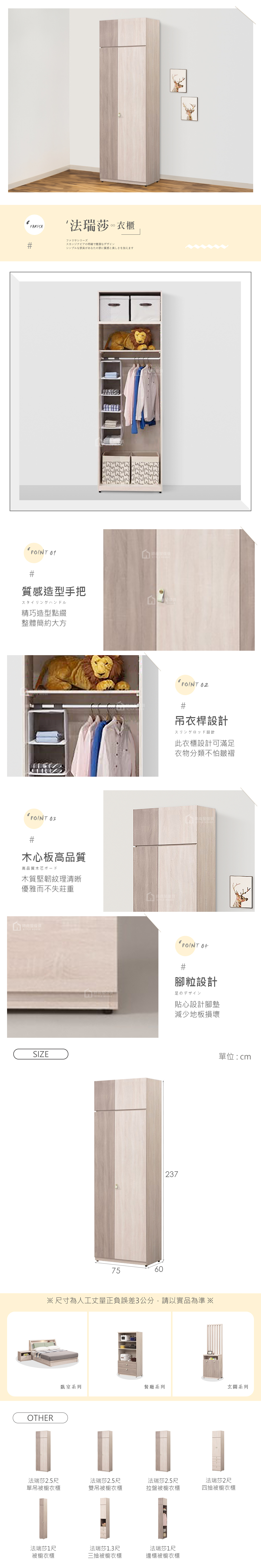 【時尚屋】[MZ23]法瑞莎2.5尺單吊被櫥衣櫃,色系白橡色為主,點綴臥室視覺空間美感,材質上採用木心板、緩衝後鈕等,均高於市場之產品規格,品質絕對有保證!此衣櫃在收納空間上採雙開門,絕對可滿足您對收納的需求,相當於收納櫃之功能!有了他絕對可以讓您煥然一新!時尚屋帶給您對家具時尚新品味。