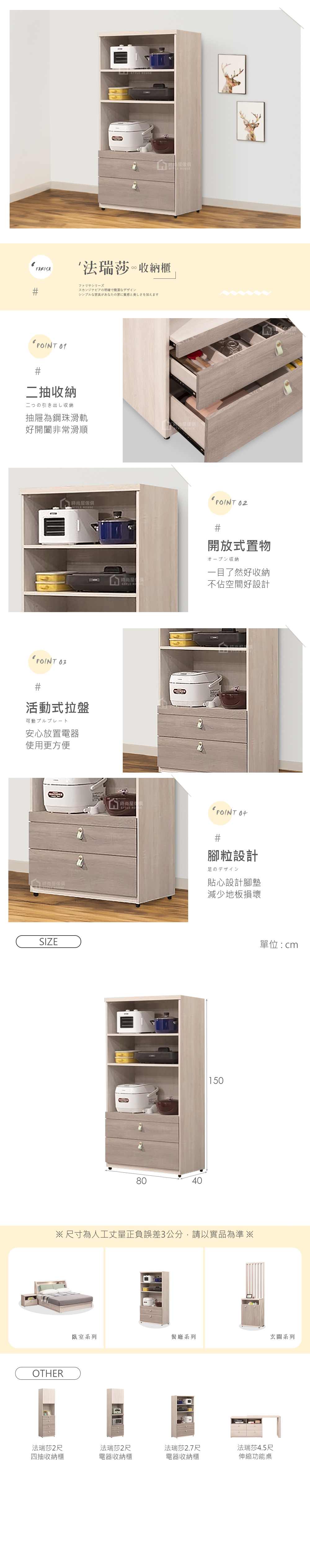 【時尚屋】[MZ23]法瑞莎2.7尺電器收納,色系白橡色為主,點綴廚房視覺空間美感,材質上採用木心板、鋼珠滑軌等,均高於市場之產品規格,品質絕對有保證!此收納櫃在收納空間上採二抽+托盤抽,絕對可滿足您對收納的需求,相當於收納櫃之功能!有了他絕對可以讓您煥然一新!時尚屋帶給您對家具時尚新品味。