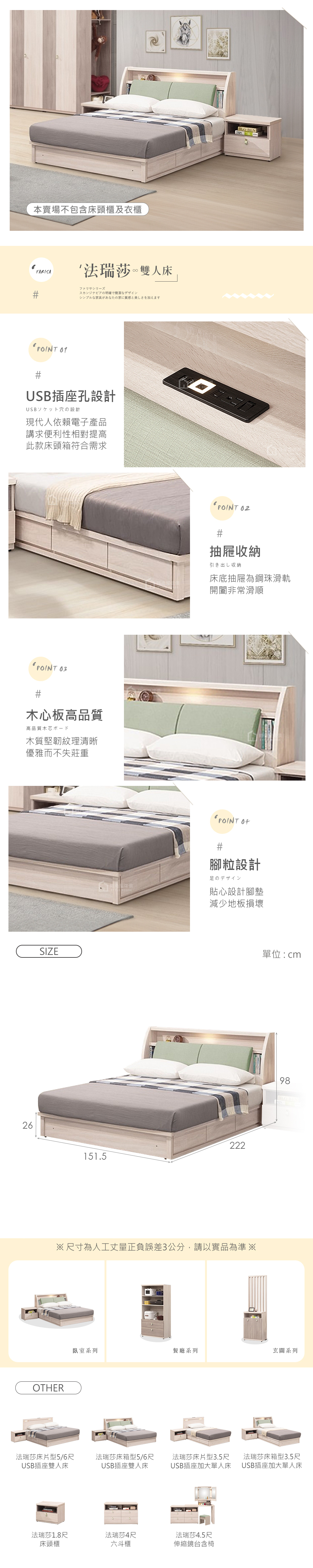 名稱:法瑞莎床箱型5尺USB插座雙人床