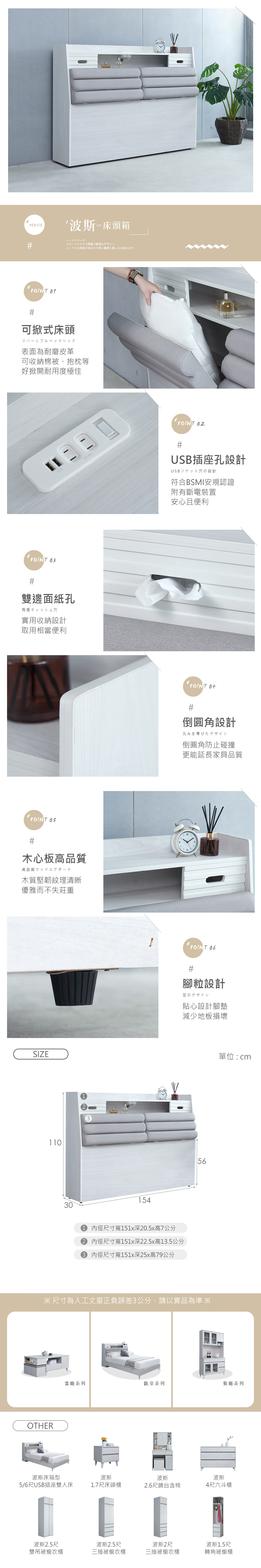 【時尚屋】[GZ13]波斯5尺USB插座床頭箱,色系橡木白色為主,點綴臥室視覺空間美感,材質上採用木心板、耐磨皮革等,均高於市場之產品規格,品質絕對有保證!此床頭箱舒適程度絕對可滿足您的需求!設計質感及耐用性絕對是首選。有了他絕對可以讓您煥然一新!時尚屋帶給您對家具時尚新品味。