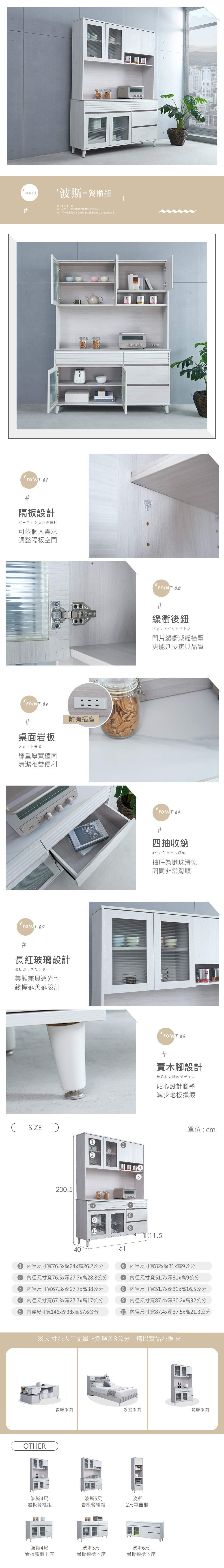 【時尚屋】[GZ13]波斯5尺岩板餐櫃組,色系橡木白色為主,點綴廚房視覺空間美感,材質上採用木心板、緩衝後鈕、鋼珠滑軌、ABS封邊、桌面岩板、實木腳等,均高於市場之產品規格,品質絕對有保證!此餐櫃在收納空間上採四抽+雙開門,絕對可滿足您對收納的需求,相當於收納櫃之功能!有了他絕對可以讓您煥然一新!時尚屋帶給您對家具時尚新品味。