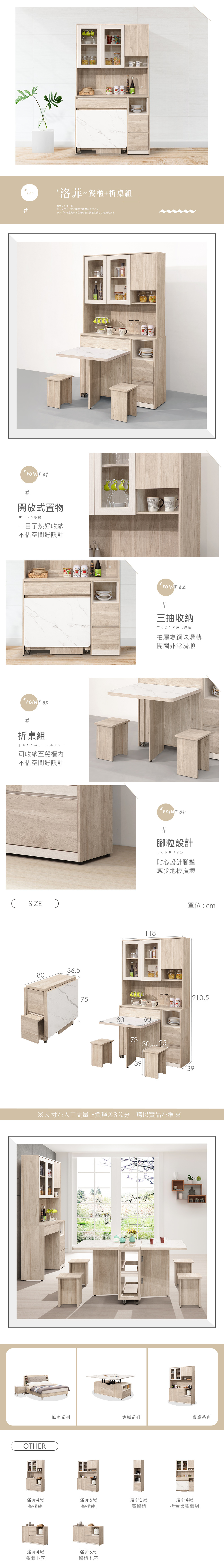 【時尚屋】[5U11]洛菲4尺折合桌餐櫃組,色系橡木色為主,點綴廚房視覺空間美感,材質上採用木心板、緩衝後鈕、鋼珠滑軌等,均高於市場之產品規格,品質絕對有保證!此餐櫃在收納空間上採三抽+單雙開門,絕對可滿足您對收納的需求,相當於收納櫃之功能!有了他絕對可以讓您煥然一新!時尚屋帶給您對家具時尚新品味。