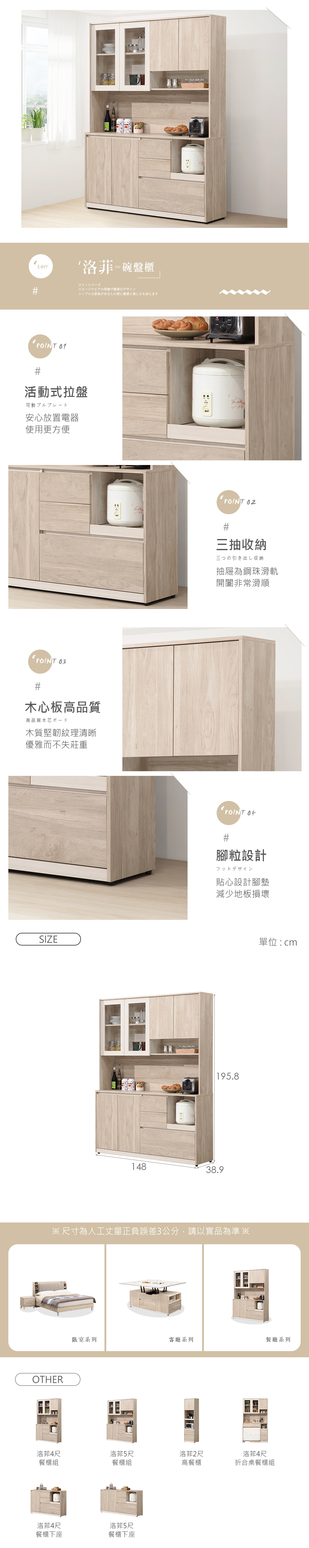 【時尚屋】[5U11]洛菲5尺餐櫃組,色系橡木色為主,點綴廚房視覺空間美感,材質上採用木心板、緩衝後鈕、鋼珠滑軌等,均高於市場之產品規格,品質絕對有保證!此餐櫃在收納空間上採三抽+雙開門,絕對可滿足您對收納的需求,相當於收納櫃之功能!有了他絕對可以讓您煥然一新!時尚屋帶給您對家具時尚新品味。