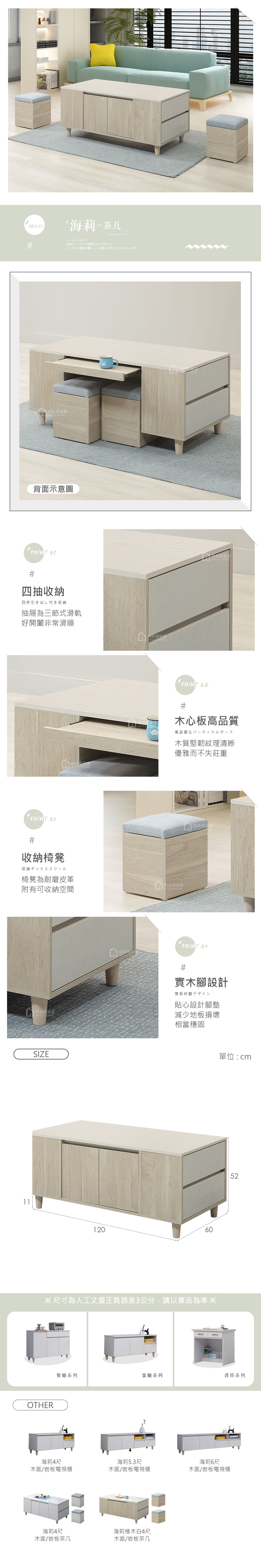 【時尚屋】[CW24]海莉橡木白4尺木面茶几,色系橡木白色為主,點綴客廳視覺空間美感,材質上採用木心板、三節式滑軌、緩衝後鈕等,均高於市場之產品規格,品質絕對有保證!此茶几在收納空間上採四抽,絕對可滿足您對收納的需求,相當於收納櫃之功能!有了他絕對可以讓您煥然一新!時尚屋帶給您對家具時尚新品味。