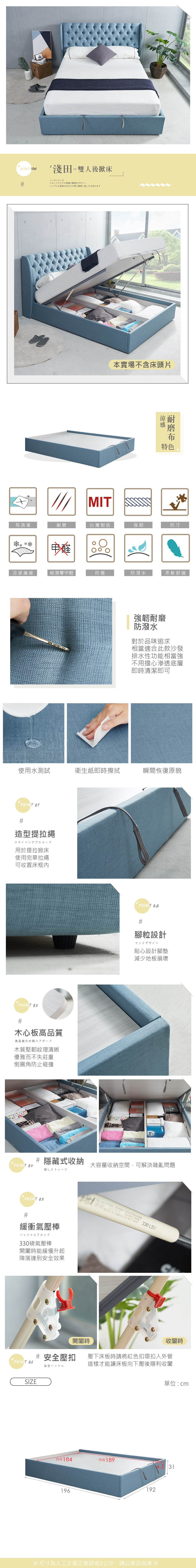 【時尚屋】[MX22]淺田6尺涼感布加大雙人後掀床,色系蒼青藍色為主,點綴臥室視覺空間美感,材質上採用涼感布、木心板等,均高於市場之產品規格,品質絕對有保證!此雙人床舒適程度絕對可滿足您的需求!設計質感及耐用性絕對是首選。有了他絕對可以讓您煥然一新!時尚屋帶給您對家具時尚新品味。