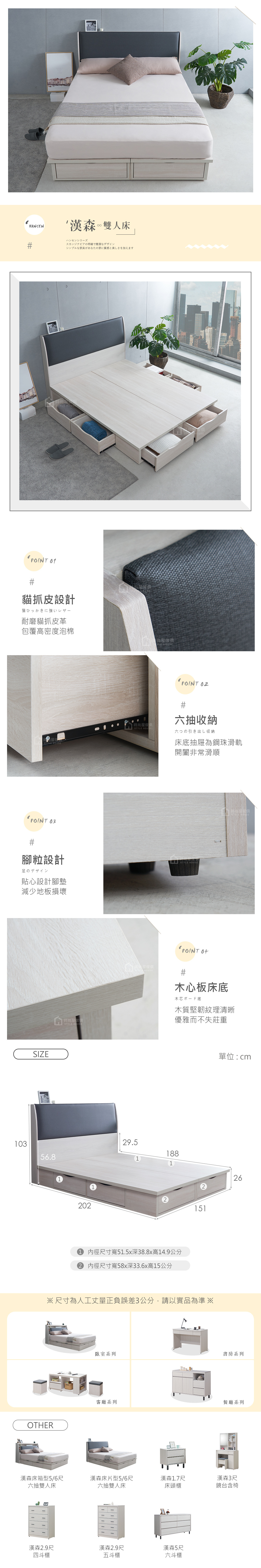 【時尚屋】[ZZ24]漢森床片型5尺六抽雙人床,色系橡木白色為主,點綴臥室視覺空間美感,材質上採用木心板、貓抓皮革、鋼珠滑軌等,均高於市場之產品規格,品質絕對有保證!此雙人床舒適程度絕對可滿足您的需求!設計質感及耐用性絕對是首選。有了他絕對可以讓您煥然一新!時尚屋帶給您對家具時尚新品味。