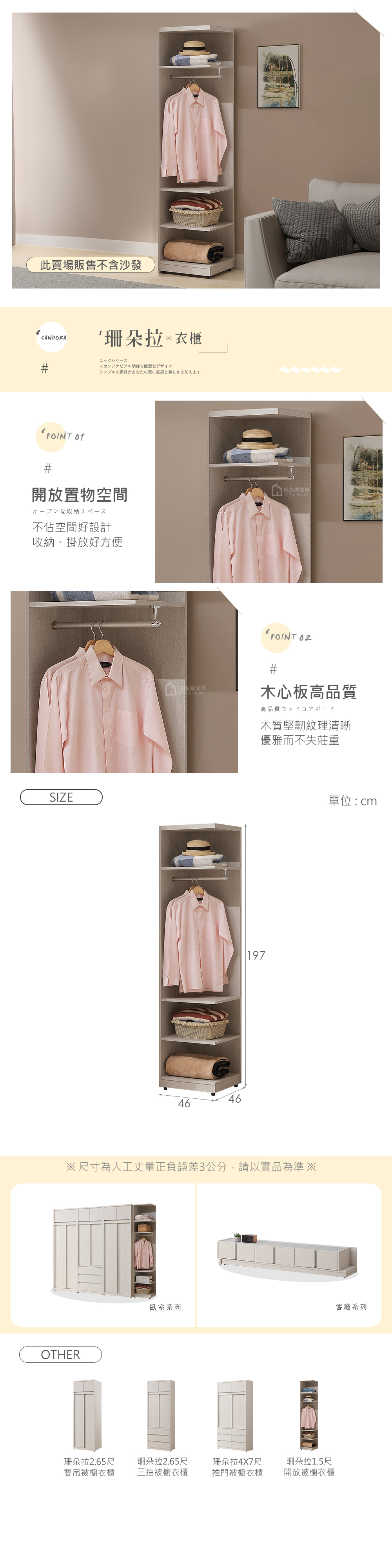 【時尚屋】[5U11]珊朵拉1.5尺開放衣櫃,色系白橡色為主,點綴臥室視覺空間美感,材質上採用木心板等,均高於市場之產品規格,品質絕對有保證!此衣櫃在收納空間上採開放式,絕對可滿足您對收納的需求,相當於收納櫃之功能!有了他絕對可以讓您煥然一新!時尚屋帶給您對家具時尚新品味。