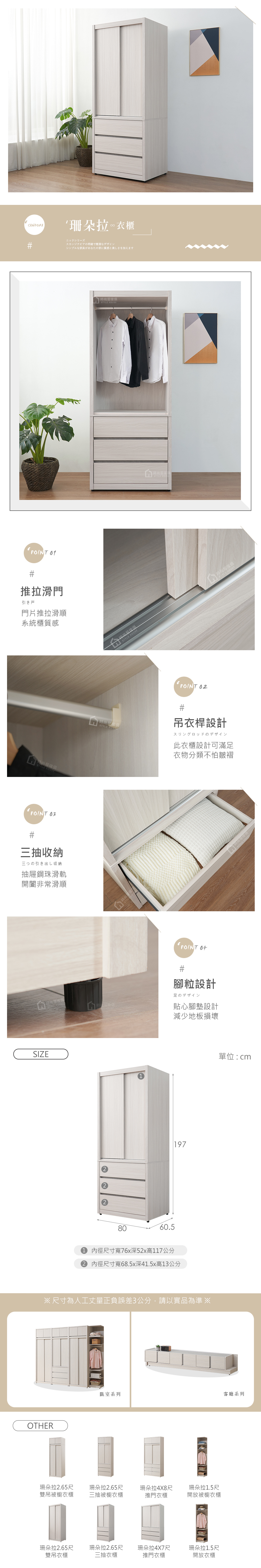 【時尚屋】[5U11]珊朵拉2.65尺三抽衣櫃,色系白橡色為主,點綴臥室視覺空間美感,材質上採用木心板、鋼珠滑軌等,均高於市場之產品規格,品質絕對有保證!此衣櫃在收納空間上採三抽,絕對可滿足您對收納的需求,相當於收納櫃之功能!有了他絕對可以讓您煥然一新!時尚屋帶給您對家具時尚新品味。
