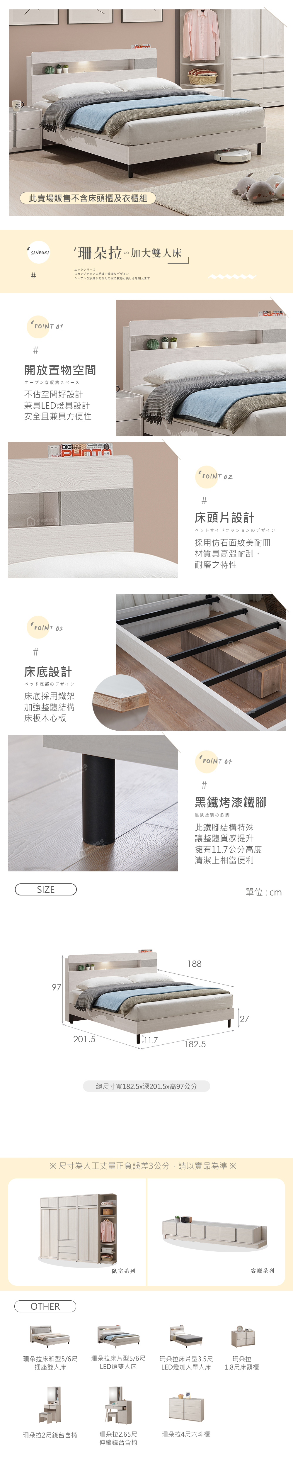 【時尚屋】[5U11]珊朵拉床片型6尺LED燈加大雙人床,色系白橡色為主,點綴臥室視覺空間美感,材質上採用木心板等,均高於市場之產品規格,品質絕對有保證!此雙人床舒適程度絕對可滿足您的需求!設計質感及耐用性絕對是首選。有了他絕對可以讓您煥然一新!時尚屋帶給您對家具時尚新品味。