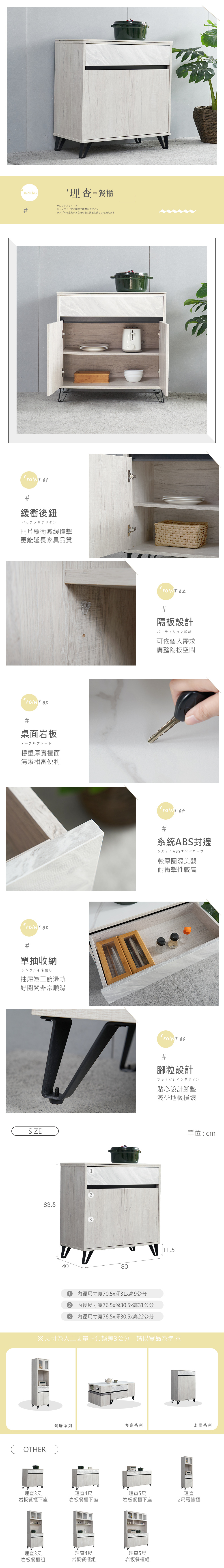 【時尚屋】[GZ11]理查3尺岩板餐櫃下座,色系白橡色為主,點綴餐廳視覺空間美感,材質上採用木心板、桌面岩板、三節式滑軌、緩衝後鈕、鐵腳等,均高於市場之產品規格,品質絕對有保證!此餐櫃在收納空間上採單抽+雙開門,絕對可滿足您對收納的需求,相當於收納櫃之功能!有了他絕對可以讓您煥然一新!時尚屋帶給您對家具時尚新品味。