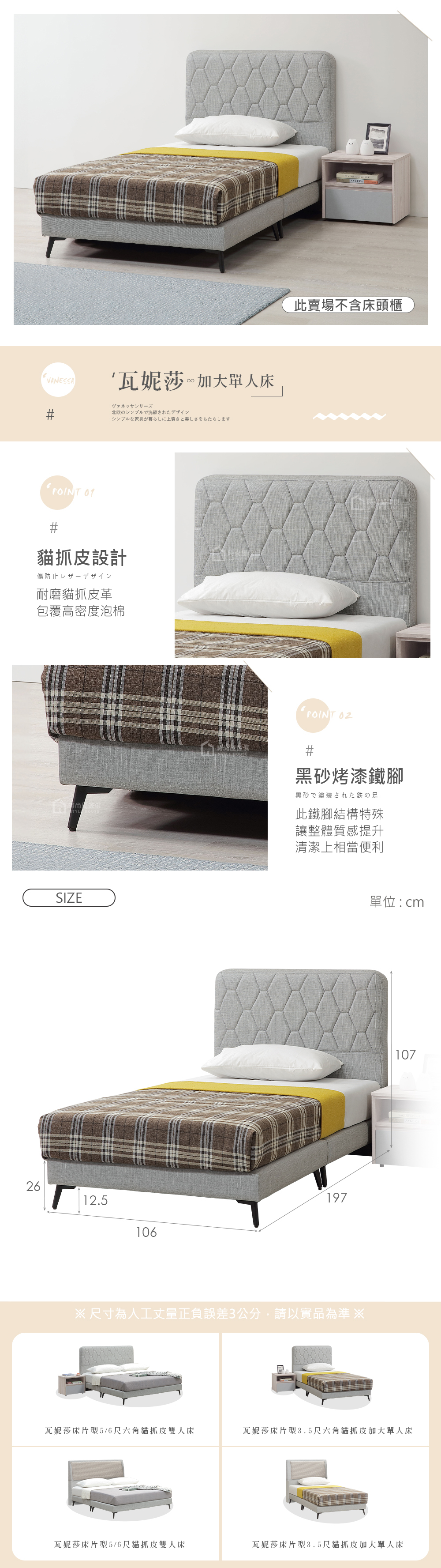 名稱:瓦妮莎床片型3.5尺六角貓抓皮加大單人床