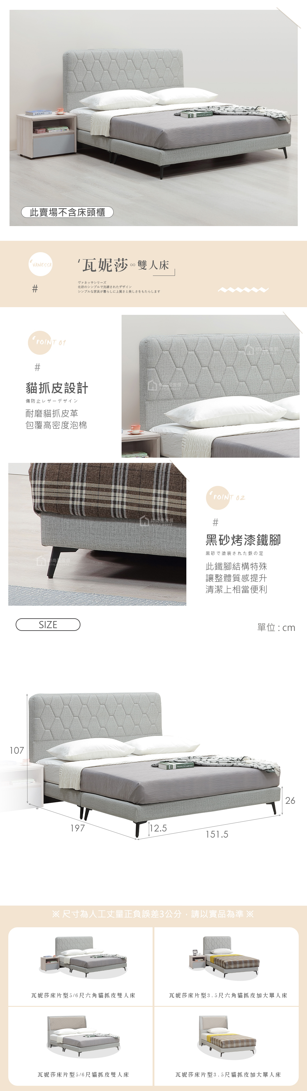 名稱:瓦妮莎床片型5尺六角貓抓皮雙人床