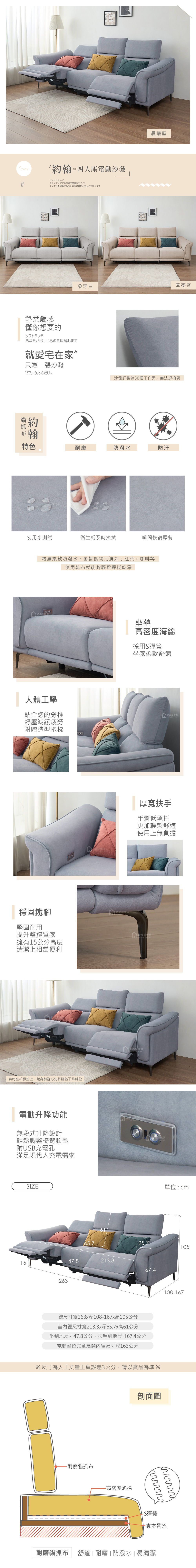 【時尚屋】[FZ11]約翰四人座貓抓布電動沙發,色系以晨曦藍色為主,點綴客廳視覺空間美感,材質上採用耐磨貓抓布、高密度泡棉、S彈簧、實木骨架等,均高於市場之產品規格,品質絕對有保證!乘坐舒適度達到最高效果!設計質感及耐用性絕對是首選。有了他絕對可以讓您煥然一新!時尚屋帶給您對家具時尚新品味。