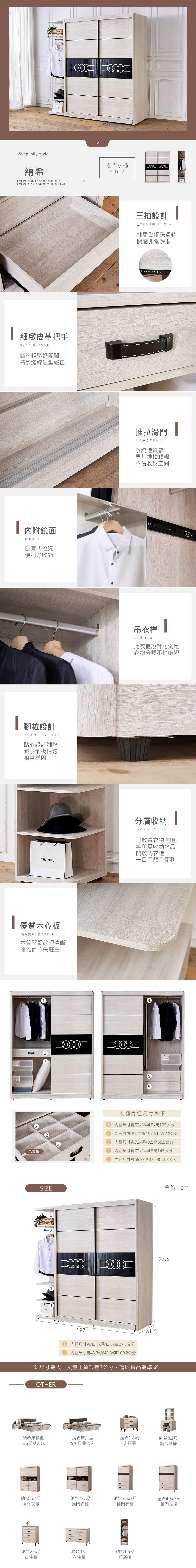 【時尚屋】[RV8]納希6.5尺推門衣櫃,色系白梣木色為主,點綴臥室視覺空間美感,材質上採木心板、鋼珠滑軌等,均高於市場之產品規格,品質絕對有保證!此衣櫃在收納空間上採三支吊衣桿+滑門+三抽,此款絕對可滿足您對收納的需求,相當於收納櫃之功能!設計質感及耐用性絕對是首選。有了他絕對可以讓您煥然一新!時尚屋帶給您對家具時尚新品味。
