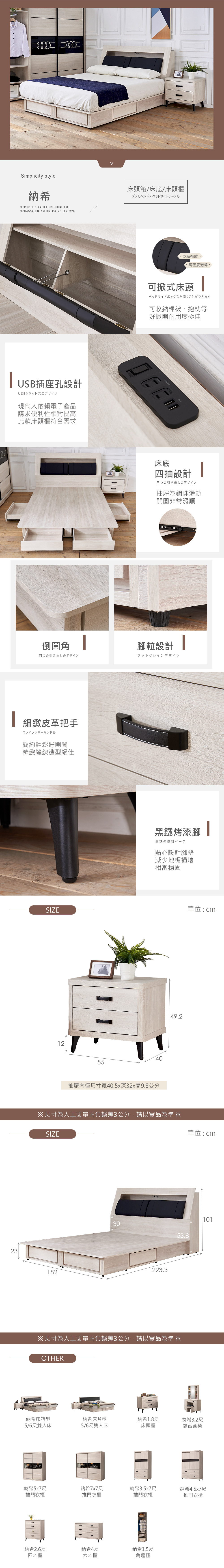 尺寸:床組-寬182x深223.3x高101公分、床頭櫃-寬55x深40x高49.2公分