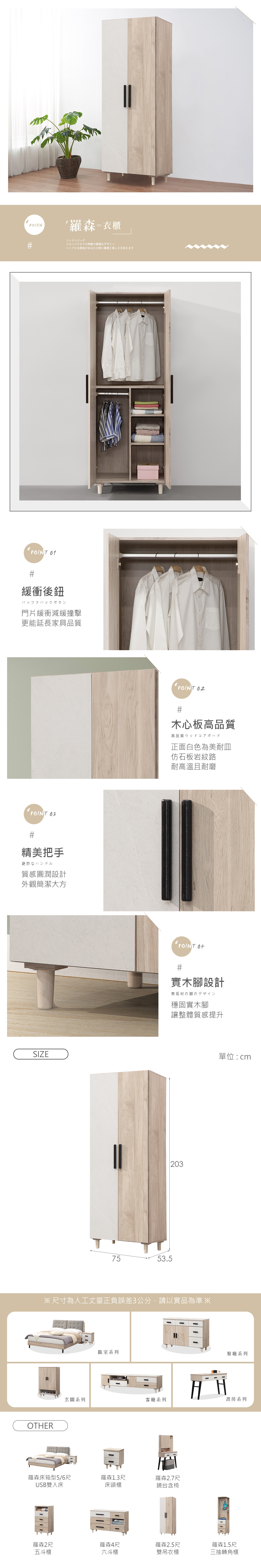 【時尚屋】[CW23]羅森2.5尺雙吊衣櫃,色系橡木色為主,點綴臥室視覺空間美感,材質上採用木心板、緩衝後鈕、實木腳等,均高於市場之產品規格,品質絕對有保證!此衣櫃在收納空間上採雙開門,絕對可滿足您對收納的需求,相當於收納櫃之功能!有了他絕對可以讓您煥然一新!時尚屋帶給您對家具時尚新品味。
