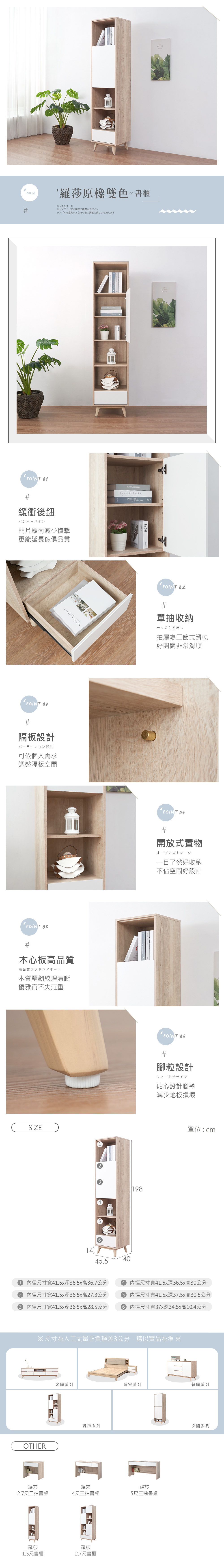 【時尚屋】[NM31]羅莎原橡雙色1.5尺書櫃,色系原橡雙色為主,點綴書房視覺空間美感,材質上採用木心板、三節式滑軌、緩衝後鈕、MDF全包式白色烤漆、紐松實木腳等,均高於市場之產品規格,品質絕對有保證!此書櫃在收納空間上採單抽+單開門,絕對可滿足您對收納的需求,相當於收納櫃之功能!有了他絕對可以讓您煥然一新!時尚屋帶給您對家具時尚新品味。