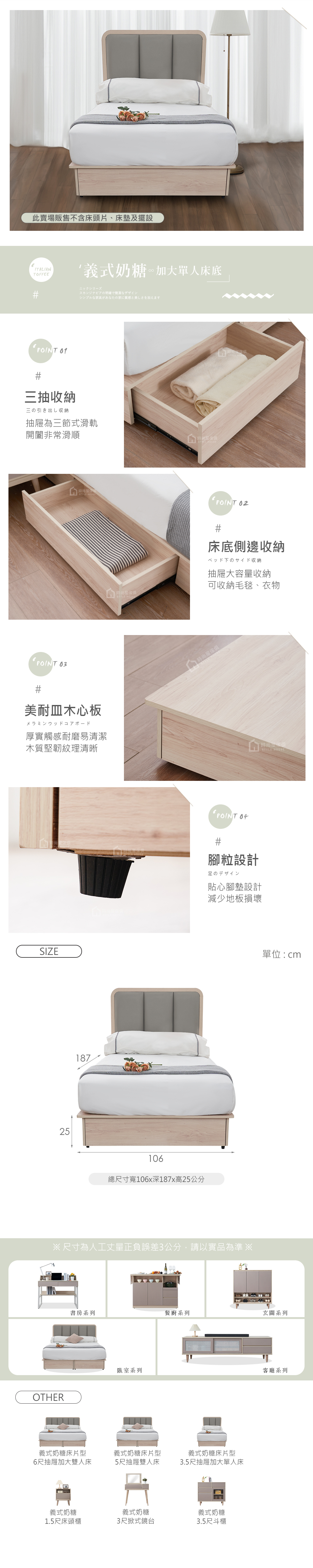 名稱:義式奶糖3.5尺三抽加大單人床底