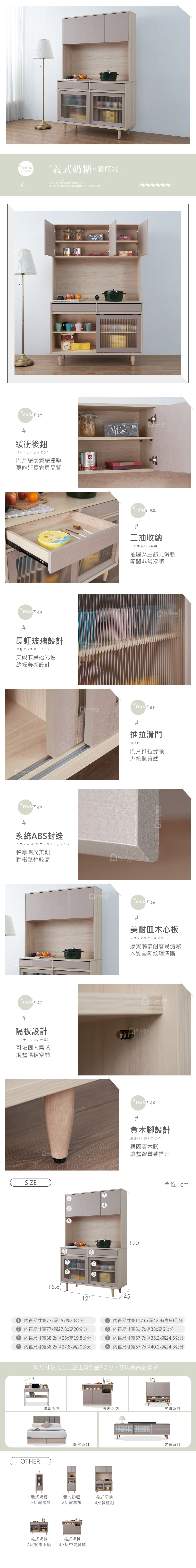 【時尚屋】[VRZ13]義式奶糖4尺餐櫃組,色系原木奶茶色為主,點綴廚房視覺空間美感,材質上採用美耐皿木心板、緩衝後鈕、ABS封邊、三節式滑軌、長虹玻璃、實木腳等,均高於市場之產品規格,品質絕對有保證!此餐櫃組在收納空間上採單雙開門+二抽,絕對可滿足您對收納的需求,相當於收納櫃之功能!有了他絕對可以讓您煥然一新!時尚屋帶給您對家具時尚新品味。