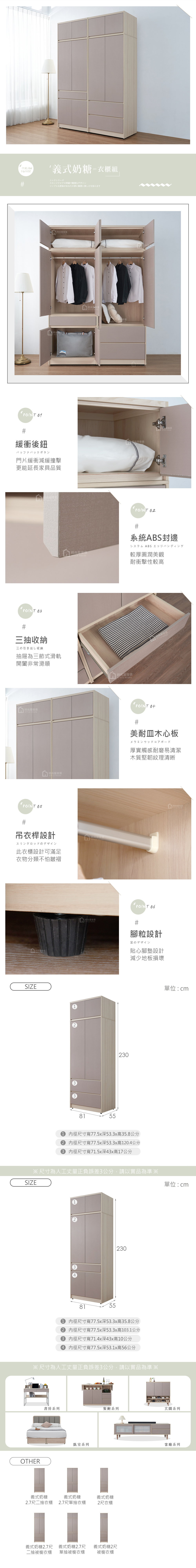 名稱:義式奶糖5.4尺三抽被櫥衣櫃